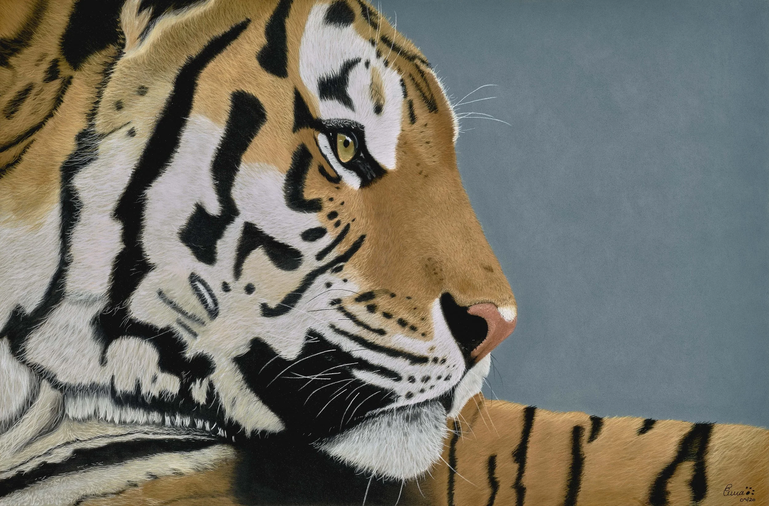 This piece was a commission for a friends son. A beautiful pastel portrait of an Amur Tiger from an original photograph by Jan Willemsen. Produced on Pastelmat paper with soft pastels and pastel pencils. The image is 56cm x 37cm.
