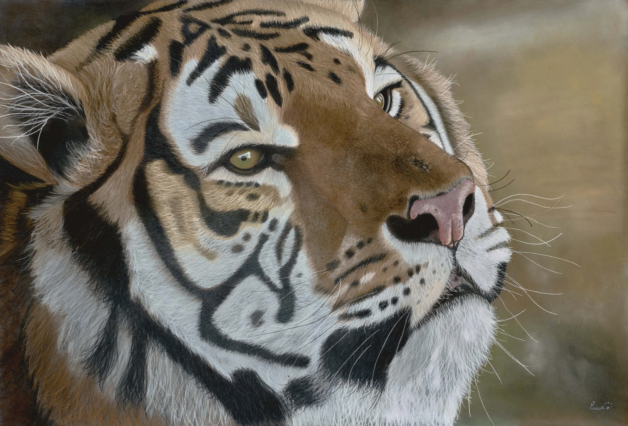A beautiful large portrait of an endangered Siberian Tiger. Produced using soft pastels and pastel pencils on Pastelmat paper. Reference photo by Jason Morgan.